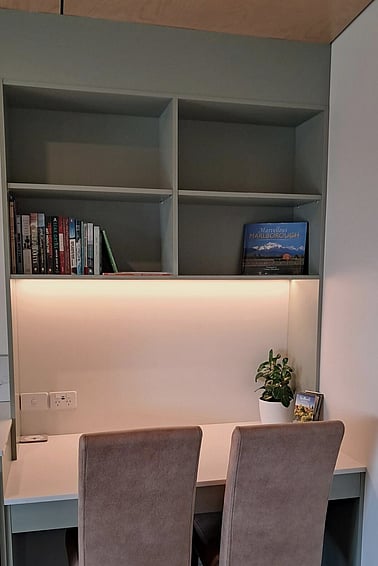 Designated workspace, with desk and LED strip lighting above